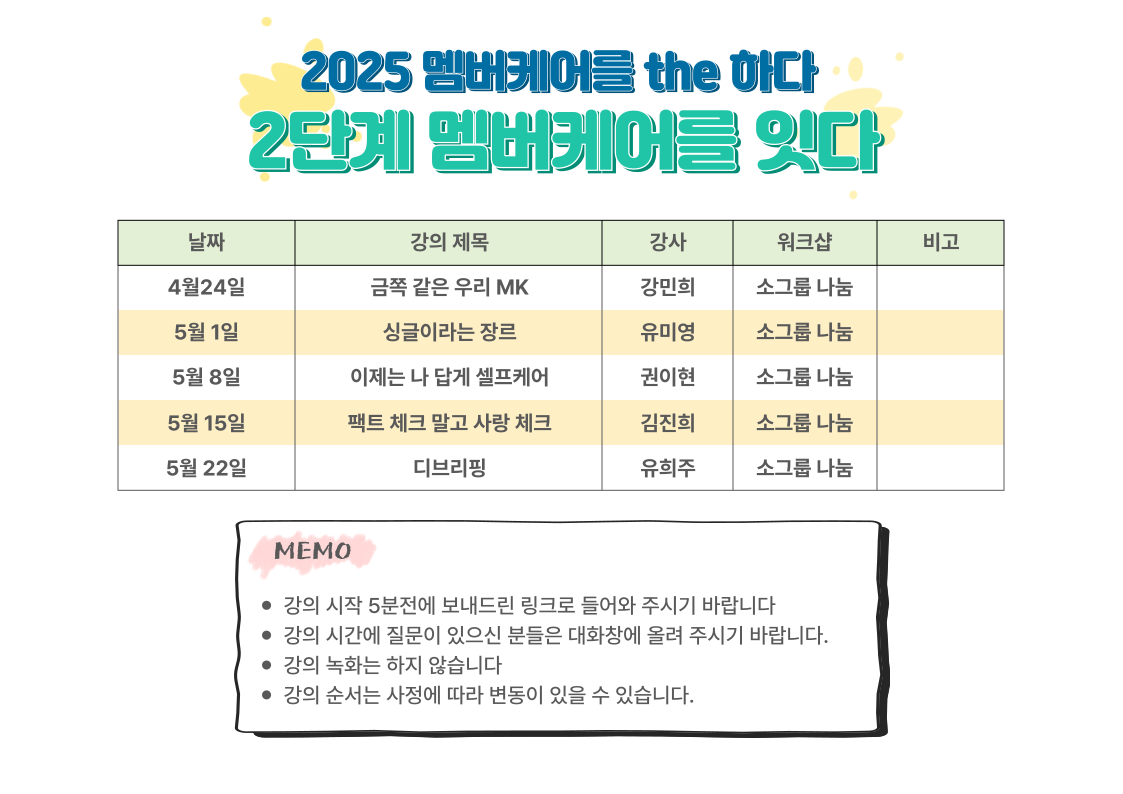 샬롬!!! KMCN 교육분과에서 멤버케어자를 위한 교육 시즌2 "멤버케어를 the 하다"의 2단계 세미나를 시작합니다.